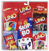 Perfect for gift-giving, the UNO 5-Card bundle features an UNO for all ages: My First with Pooh, regular UNO, Batman UNO, Barbie UNO (California Girl) & SkipBo.