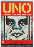 The fourth offering in the special UNO Artiste Series features the distinctive bold style of "Obey" street artist Shepard Fairey. With contemporary graphics and intricate designs, Fairey's art has reached everyone from skateboarders to presidents, inspiring fine art to activism. This special edition of the UNO® game features his art on every card as well as four special, two-sided cards that when put together create two different art pieces. It's a game time masterpiece! Just as important – this deck is fully recyclable, with everything made from paper. In celebration of this special deck, Mattel has donated to Ocean Conservancy, a favorite cause of the artist.