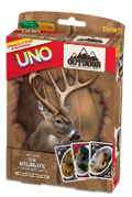 Join the great outdoors with the North American Wildlife Edition of UNO! 112 Custom Cards feature big game animals from all over North America. Same great UNO play PLUS the exclusive Ranger card which forces opponents to show their cards. Be sure to shout "UNO" as you go for the win. Ages: 7+ | Players: 2-10 |