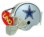 UNO Dallas Cowboys Helmet Edition Get ready for a ride on the Road to the Superbowl with the Dallas Cowboys Edition of UNO. 112 Custom Cards feature Drew Bledsoe, Julius Jones, Terry Glenn, Roy Williams, Jason Witten, and many more of your favorite Cowboys players. Same great UNO play PLUS the exclusive Acquisition Card celebrating the signing of Terrell Owens. Don't forget to yell "UNO" as you go for the win with America's Team! Ages 7+ |