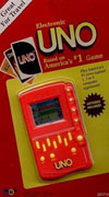 [next on left product # 42374 released 2000 discontinued 2003 ]Combines the #1 brand of family game, UNO, with the excitement of virtual card play. The object is to get rid of all your virtual cards first. And just like regular UNO, you have to remember to yell "UNO!" when you have just one card left. |