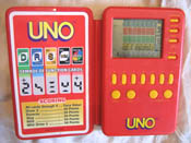 It's Amercia's favorite cardgame packed into a palm-sized, take-along electronic version! Easy to learn, UNO requires quick wits and strategy. This game console features a unique card selector-- press it into the unit to scroll thru cards. You've never seen anything like it! Then, there are three skill levels to challenge you. Meet up with a worthy electronic opponent at each level. Get rid of your virtual cards first to win points-- first to 500 points wins! Will it be you or your digital rival? High score button keeps track of your victories and zany sound effects liven the action. Includes automatic shutoff and three AAA batteries. For 1 player.