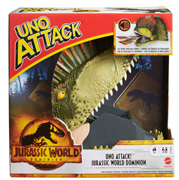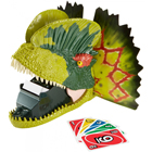 The Jurassic World Dominion edition of UNO Attack game features a card-launching machine in the shape of a dinosaur head that shoots cards high into the air. Lights & dinosaur sound effects build over time to heighten the thrill -- the suspense builds, too, as players wait to see when the cards will shoot out! Stack the cards in the machine, then play by the classic UNO card matching rules. If the Attack card comes up, watch out! When players have only one card left, they must still roar "UNO!"