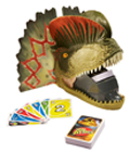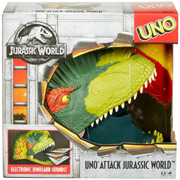 You've never played UNO like this before! Now with a Jurassic World theme, the rules are similar to those of regular UNO Attack, but this game features the "Attack! Attack!" command card that offers an exciting & unpredictable way to play UNO . If you draw that card you'll have to push the button on the Dilophosaurus shooter, & you'll either be the target of a stream of UNO Attack Jurassic World cards, or you will get lucky & nothing will happen! But if you're not so lucky, the shooter will fire a stream of cards that you have to add to your hand! And when the shooter is launching cards, it makes a variety of funny sounds that add energy & silliness to the game. UNO Attack Jurassic World adds speed & surprise to the game because you never know when an attack is coming!