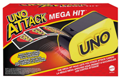 This edition of the UNO Attack Mega Hit game, features a card launcher with a sleek design that shoots cards high in the air! Cool lights & sound effects flash faster each time the button is pushed, adding to the suspense. The anticipation waiting to see when the cards will shoot out is almost unbearable! Stack the cards in the machine, then play everyone's favorite color & number-matching game. If the Attack card comes up, watch out! Includes UNO Attack® machine, 112 cards & instructions.