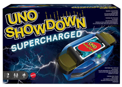 UNO Showdown Supercharged is the matching card game everyone loves but with the unexpected excitement of a card-shooting smackdown! When the supercharged lightning sounds & the UNO Showdown Supercharged unit signal goes off, be the first to push down on the paddle. The quickest player wins the showdown & sends cards flying out of the UNO Showdown Supercharged unit at their opponents! This exclusive version has a unit design & sounds that are unique to this edition.
