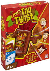 An interesting variant on the classic UNO theme in which players spin a tiki idol to learn their destiny! The mischievous tiki idol has taken over the game and whoever he points to must obey his commands. Sometimes he will be kind, allowing you to discard certain cards; other times he will be cruel, asking you to pick up even more cards! Sixteen unique action cards add unpredictability to every round.