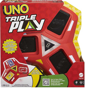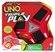 The UNO Triple Play game is 3x the fun, with this special unit that holds 3 discard piles & features exciting lights & sounds for suspense & surprise! Game play is like classic UNO, but players may only discard to any pile(s) that are lit up on their turn. If any pile gets too many cards in it, it may OVERLOAD! If it does, the LED display dictates how many cards must be drawn! Lights & arcade sounds on the machine create maximum anticipation & excitement, & the 'Timer Mode' makes the game move even faster!