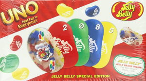 UNO teams up with Jelly Belly for this special edition of the fast-paced card game loved by millions. Each game box includes a special deck of bean-shaped UNO cards, Jelly Belly jelly beans and special rules that sweeten the play. Contents: 54 cards, 3.5 oz. Jelly Belly jelly beans (5 flavors)